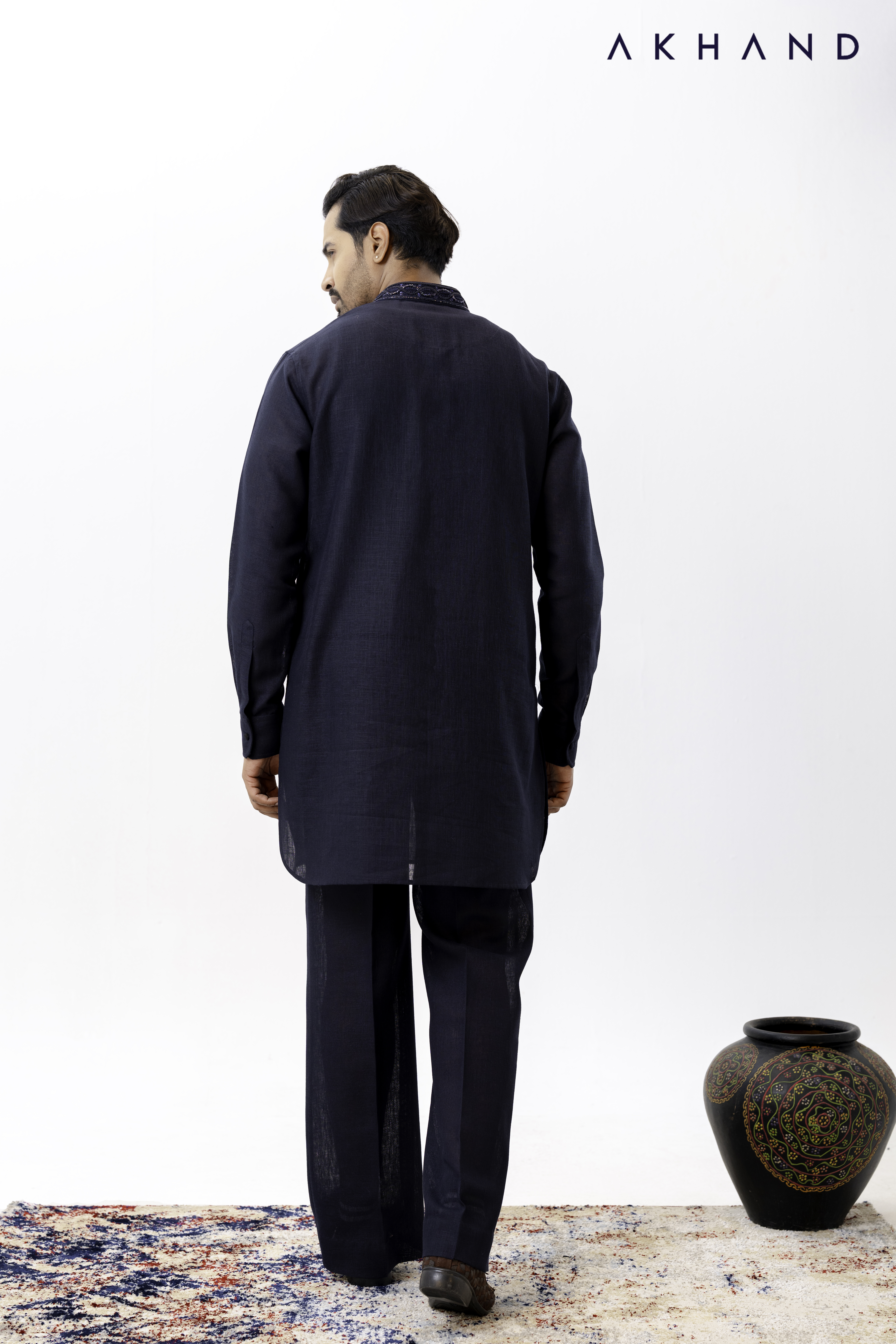 All Over Hand Embroidery Black Panjabi With Loop Button.