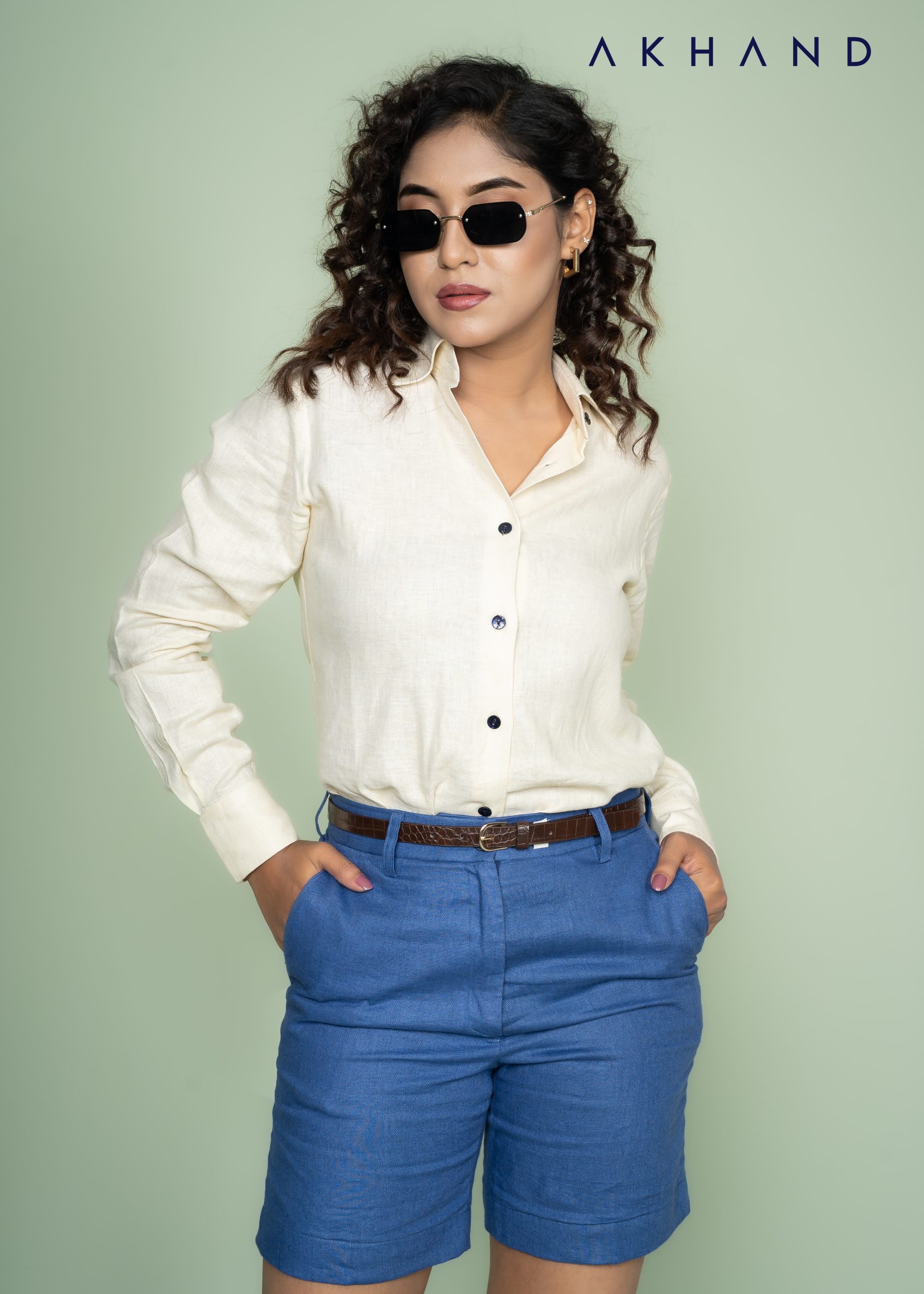 Top: Long Sleeve Basic Light Yellow Color Shirt. Bottom: Straight Cut Short Blue Trouser. FABRIC: Premium Linen Fabric. LINING: 100% Cotton.
