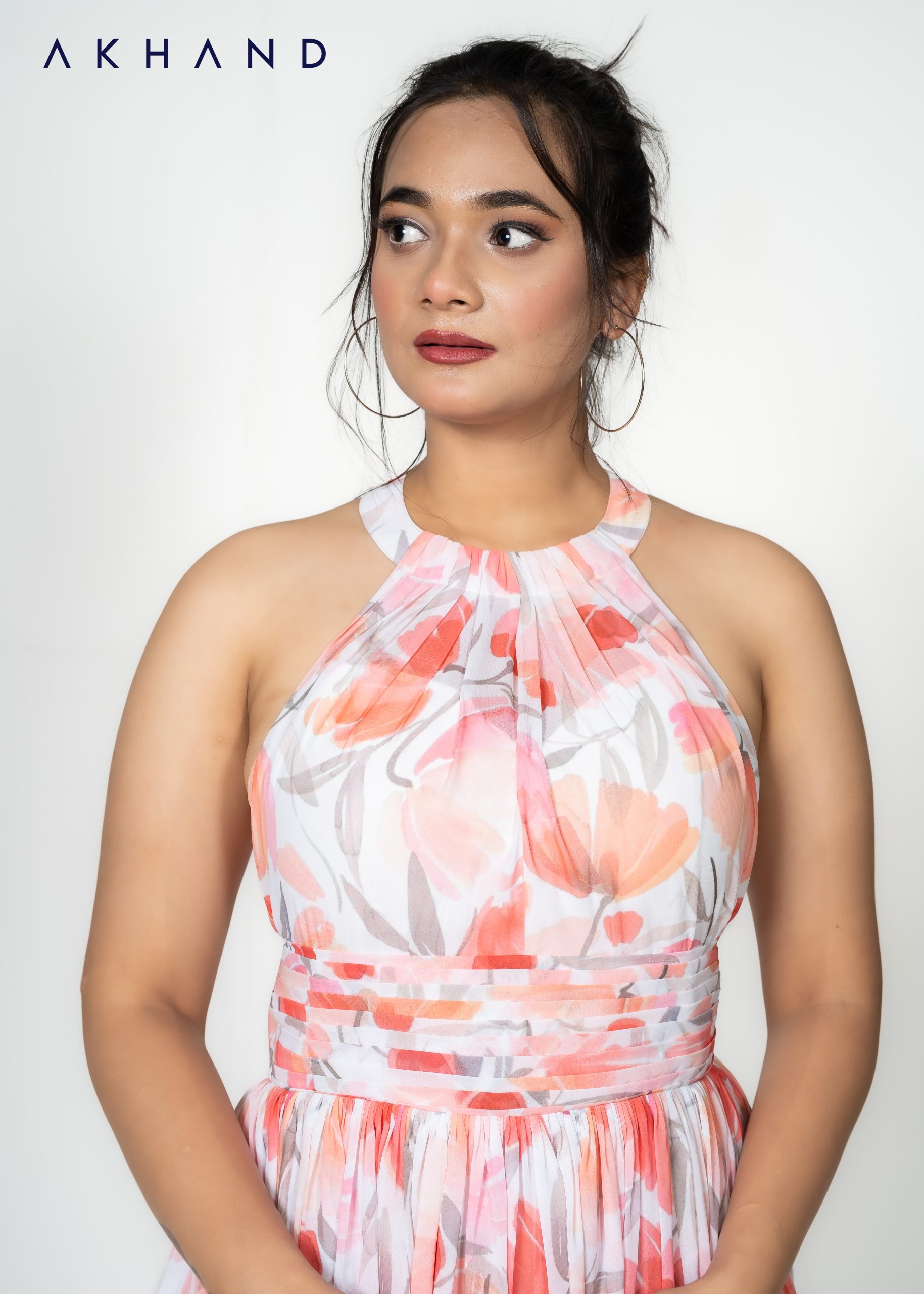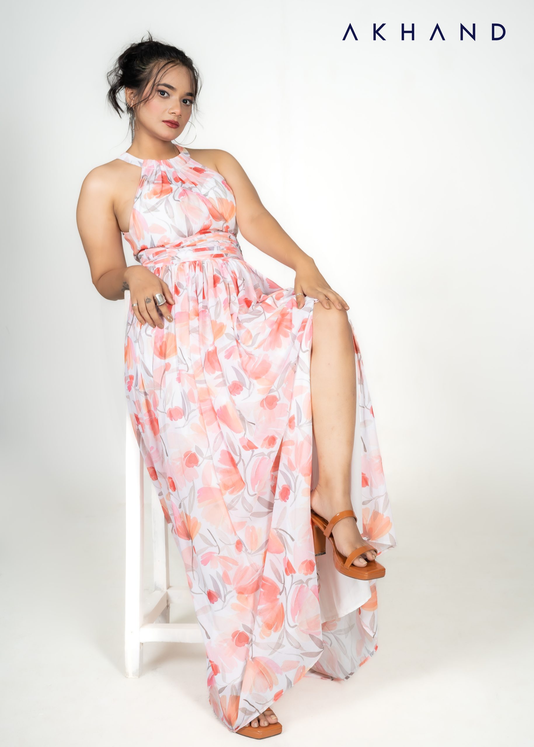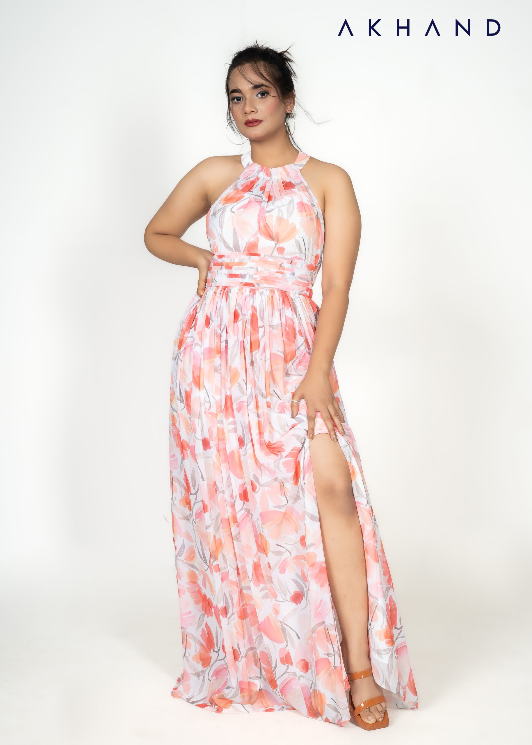 The Floral Bloom Printed Gown with side Slit Halter Neck